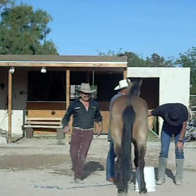 Man dressed as cowboy tries to mount horse as friends steady it, man falls off several times.