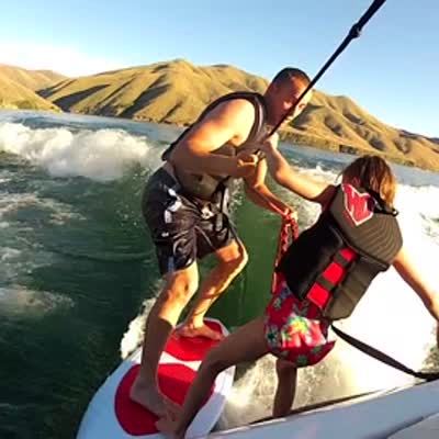 A man on a wake board holds it steady for a girl to get on with him. At 00:16:00 the girl steps on and the board tilts, sending both of them into the water.