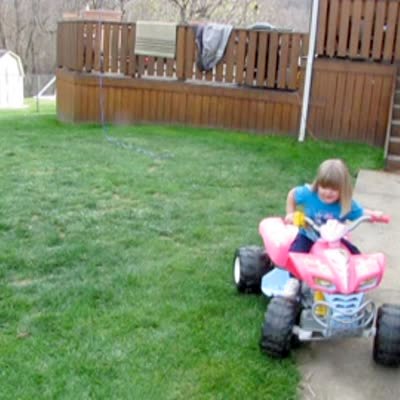 A tot girl on a barbie four wheeler rides around a back yard runs over her sister after her sister brags about teaching her how to drive it.