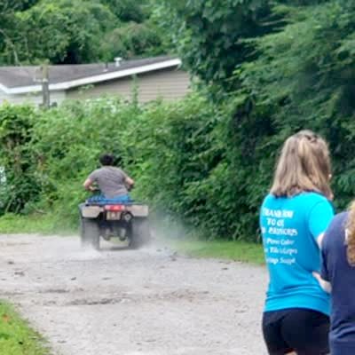 A woman sits in a toy car as her family pulls her behind the real car, and drive down the street. The toy car crashes into a satellite dish, and falls apart.