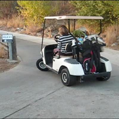 Woman driving golf cart with teen girl has trouble making turns & drives into a bush. While trying to recover, the cart crashes into another bush. Long for edit. Boneheads.