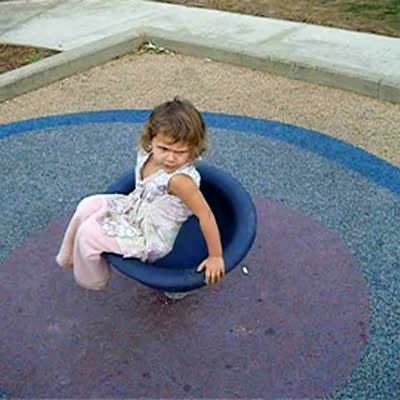 Little girl spins herself around on a spinning chair at the playground, she yells to dad for help.