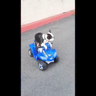 A small dog rides on/ steers a toy four wheeler around a parking lot.