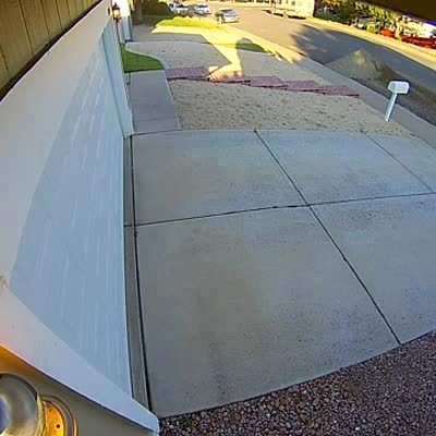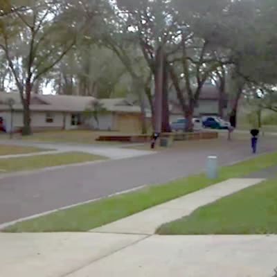A car drives through a pile of concrete rocks in the street. Home security footage.