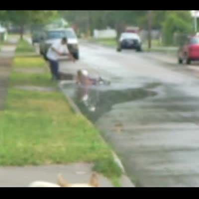 Little girl rides her bike with no training wheels for the first time. She crashes into a puddle.