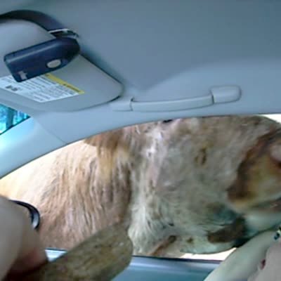 Longhorn steer / cow sticks its head in car window at animal safari, licks older woman. She pats it, says "I love you too"