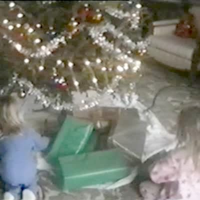 Tot girl drives toy jeep into Christmas tree, knocking it over.