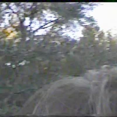 A teen boy attempts to do a wheelie trick on a motorcycle in the driveway of a home, but he loses control and falls through a fence. Security footage.