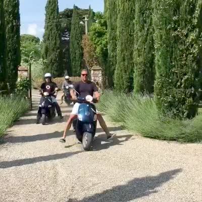 Two men rev Vespa engines and crash in the driveway, then another driver safely pulls into the spot.