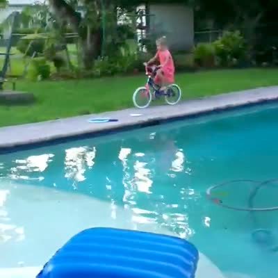 A young girl rides her bicycle around the edge of the pool but then loses control and falls in.