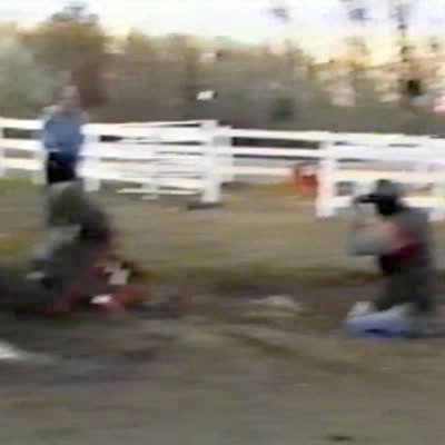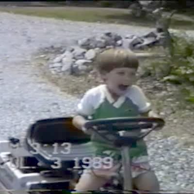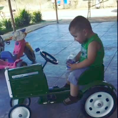 A tot boy drinks water out of a plastic bottle while sitting on a toy tractor outdoors. He leans forward to set the water bottle down when he loses his balance and smashes his head into the tractor steering wheel while simultaneously crushing the water bottle. Vine/instagram.