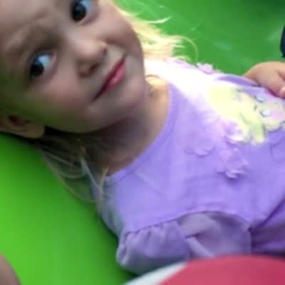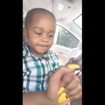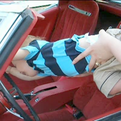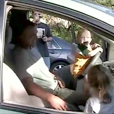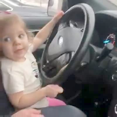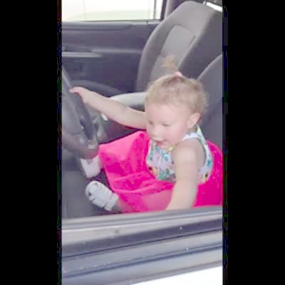 A tot baby girl pretends to drive a parked car in a drivers seat. Her Aunt goes to adjust her seat, the back pops up, and squishes the baby's head against the steering wheel. Her head honks the horn.