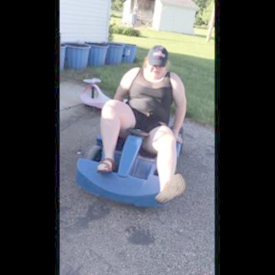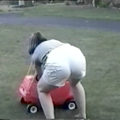 A teen girl sits in a car meant for a toddler and struggles to get out and breaks the steering wheel when it gets stuck in her butt.