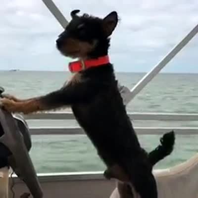 A Jack Russell Terrier dog puts both of his paws on the steering wheel of a boat and pretends to drive.