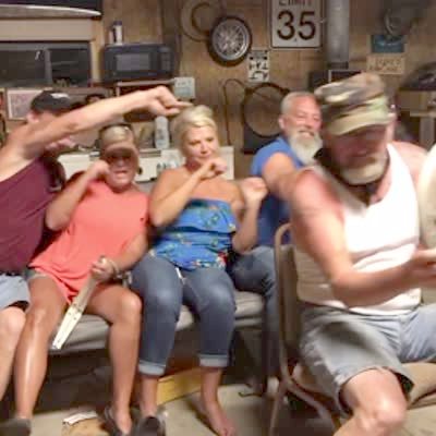 Two men and two women fall in the garage when a couch (long seat from a truck) tips backwards as they sit on it together after they all lean back at the same time while a man sits in a chair in front of them and makes car engine noises while he uses a bicycle tire as a steering wheel.