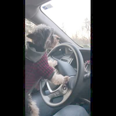 A woman drives a car and a Yorkie sits on her lap and stands against the steering wheel. A man sits in the passenger's seat and they pretend that the dog drives the car and tells him where to turn.