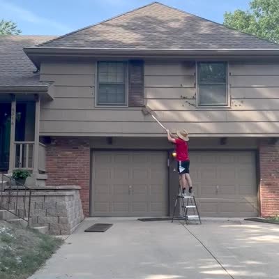 A man stands on a stepladder and uses a shovel to remove a shutter from the exterior of a house. When the shutter falls away, a colony of bats to fly out from under it. The man steps back and falls off the ladder and onto the driveway, rolling toward the front lawn.