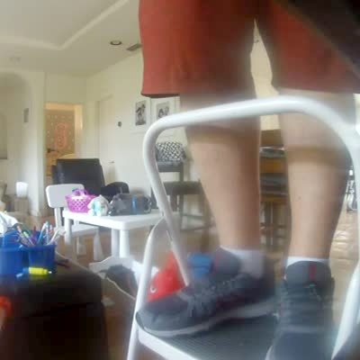 A man works on a step ladder in a living room, then he misses a step when he comes down, and he hits several toys and flips a table as he falls. Security footage.