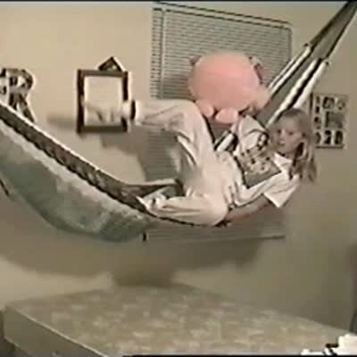 Girl falls off hammock onto bed then off the bed into a stereo cabinet.