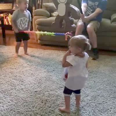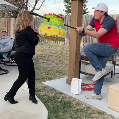 A man holds up a piñata for young boy to hit with stick but young boy whacks man's arm instead. Featured talent clear the man holding the piñata and the boy swinging the pole).