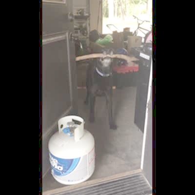 A dog finds a stick outside when her owner calls for her to come she gets stuck with the stick in the stairs lead to the deck,