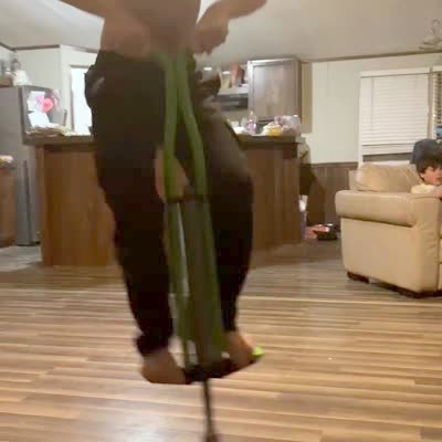 A man uses a Pogo stick to try and break up an icy front porch when he gets mad and throws it but it bounces up and hits him and he slips and falls. Security footage.