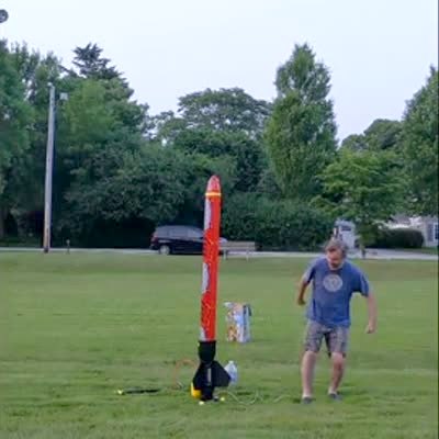 As a young boy puts a toy rocket onto its launcher, a young boy says, "I'm ready for it to hit me in the head." When he puts his rocket on, the younger brother steps on the launcher and the rocket hits the older brother in the head.