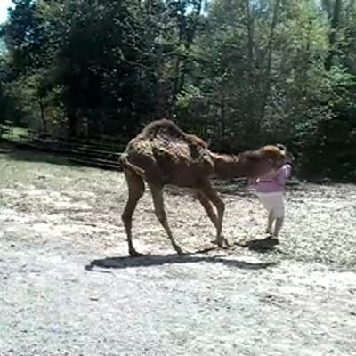 A woman gets chased by a camel at a petting zoo and she trips and falls and it start to attack her.