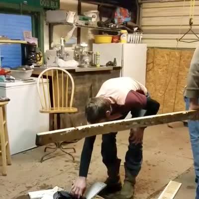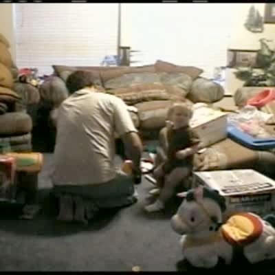 A man lays in a hammock in the basement and a pole rips away from the wall and he falls and a woman on the steps stomps her foot and says "what did I just say!". Security footage.