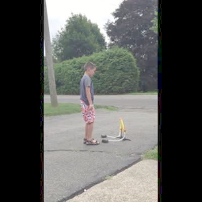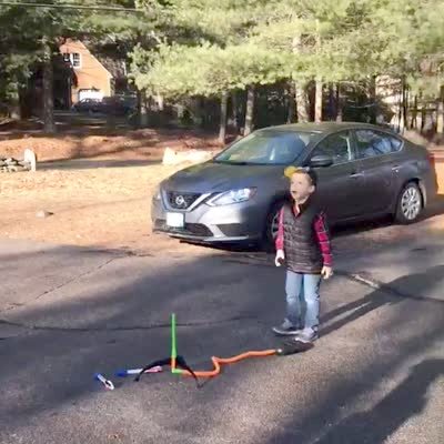 A young boy in a driveway fires a stomp rocket into the air and asks where it went and it falls down and it hits him on the head.