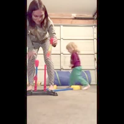 A tot girl jumps on a stomp rocket in the garage, her mother bends over to pick it up, and she jumps on another stomp rocket to hit her mother in the face.
