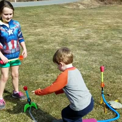 A young girl steps on a pump launching a stomp rocket into the face of the boy standing next to her.
