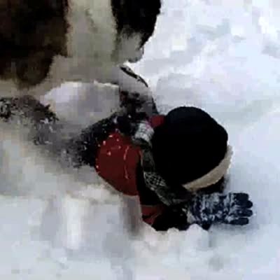 St. Bernard dog plays with little boy lying in snow, runs and stomps his face in snow, boy cries.