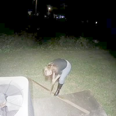 A woman steps on a plank of wood and it hits her in the face in a yard. Security camera footage.