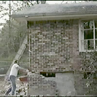 A man uses a hammer to knock masonry off of a fireplace in a living room. Then many of the stones fall down at once and knock him over.