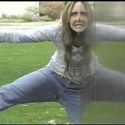 Senior woman & friends take turns standing next to a mirrored stone. Half of each body reflects onto surface. Person moves around to make it seem like they're flying or swimming.