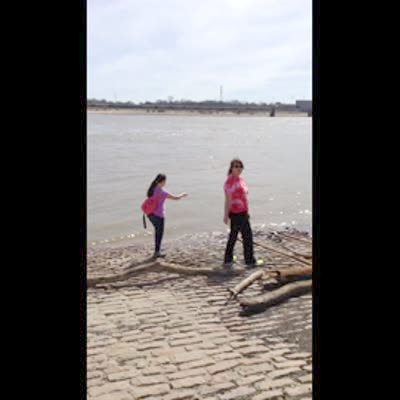 A group of people skip rocks in a river and at the end, a woman throws her rock but accidentally hits the girl next to her in the head.