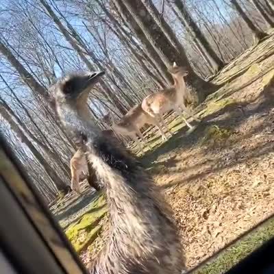 A man holds his hand out of a car and feeds an emu some pellets. The man says, "Ow!" each time the emu pecks at his hand. The ostrich then goes to teh front window and pokes his head in but a woman screams as she asks someone to close the window. A young boy asks her to stop because he can't see the emu.