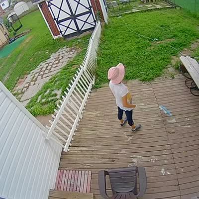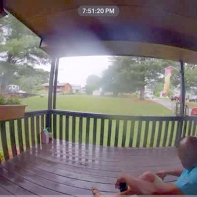 An older man trips and slams into the outdoor security camera while he walks on a wet outdoor deck. Security footage.