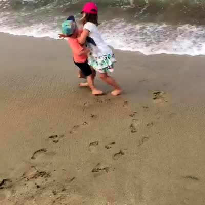 A young boy and girl run towards a wave at the beach, then she stops suddenly and runs back into the boy who falls.