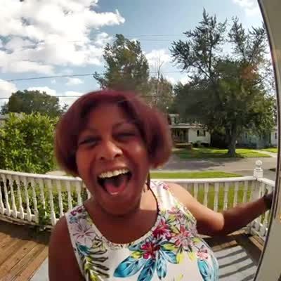 A woman adjusts a rug on the front porch, then she stops and frowns when a male voice says "what are you doing lady?" through the doorbell camera. Security footage.
