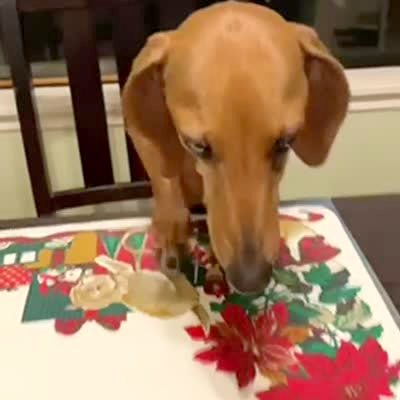 A dachshund sits in a dining room chair while people sing "Happy Birthday" to him, then they stop their song in the middle when the dog falls out of his chair.