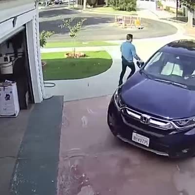 A woman runs down the driveway to try and catch her husband before he drives away when she stumbles and face-plants onto the driveway. The man gets out to help her but forgets to put the vehicle in park. Then the car starts to roll down the street with their kids inside of it, as he runs to jump in and stop it." Security footage.
