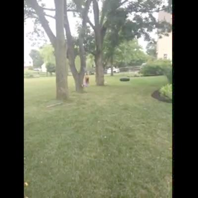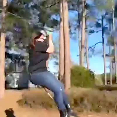 In the backyard a woman zip lines down from one tree and doesn't stop so she collides into the other tree.