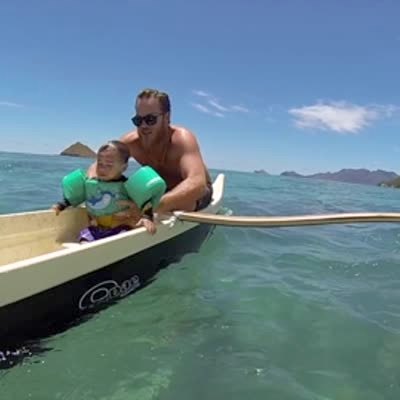 A tot boy falls out of a boat as his dad paddles and his dad stops to pull him out of the water.