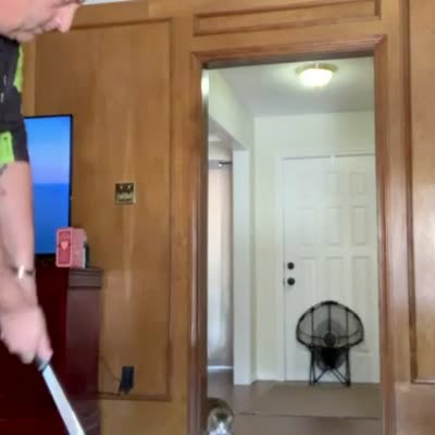 A man tries to chip golf balls into a net but his cat repeatedly jumps up and stops them from going in.