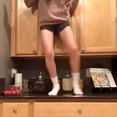 A teen girl dances on the counter, and when he tries to get down she slips and her shorts catch on a cabinet door giving her a wedgie. The door flies open and she hangs in the air for several painful seconds.