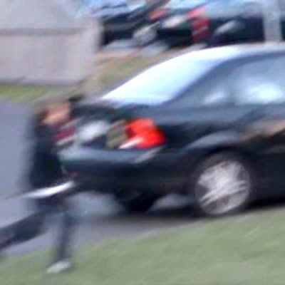 Teen boy chases a car and hits a stop sign. You hear a "bonk" sound as he falls. No tail.