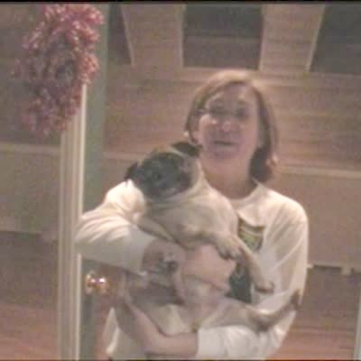 Pug dog looks funny when woman asks if he wants to go for a walk. Dog has his tongue sticking out & makes strange noises.