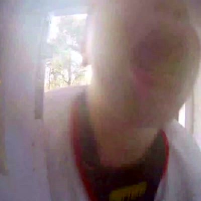 A boy makes strange faces and noises at a doorbell camera on the front steps. Then a girl opens the door and hits him in the face.
